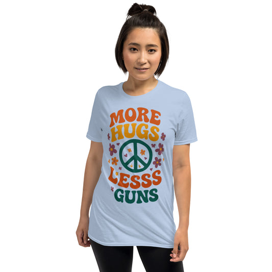 More Hugs Less Guns T-shirt – Retro flower power stijl