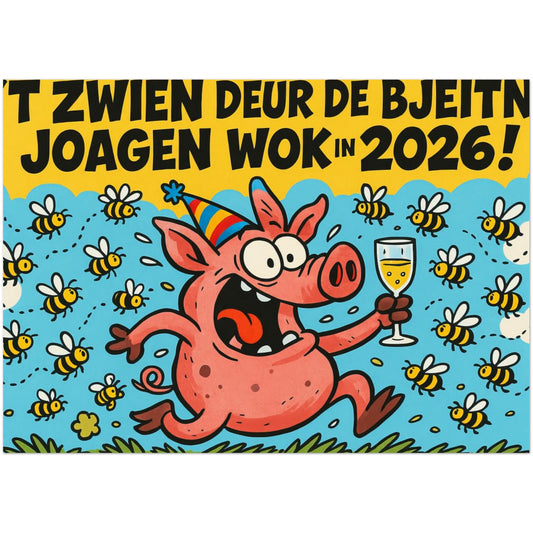 West-Vlaamse nieuwjaarskaartjes – ’t Zwien deur de bjeitn joagen wok in 2026! (set van 10, incl. enveloppen)