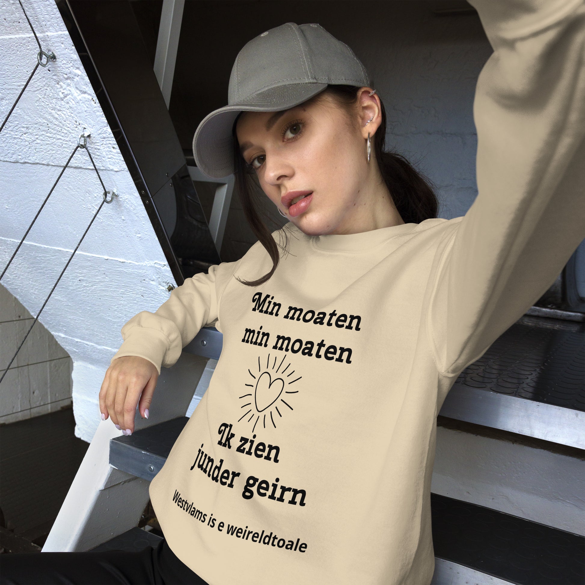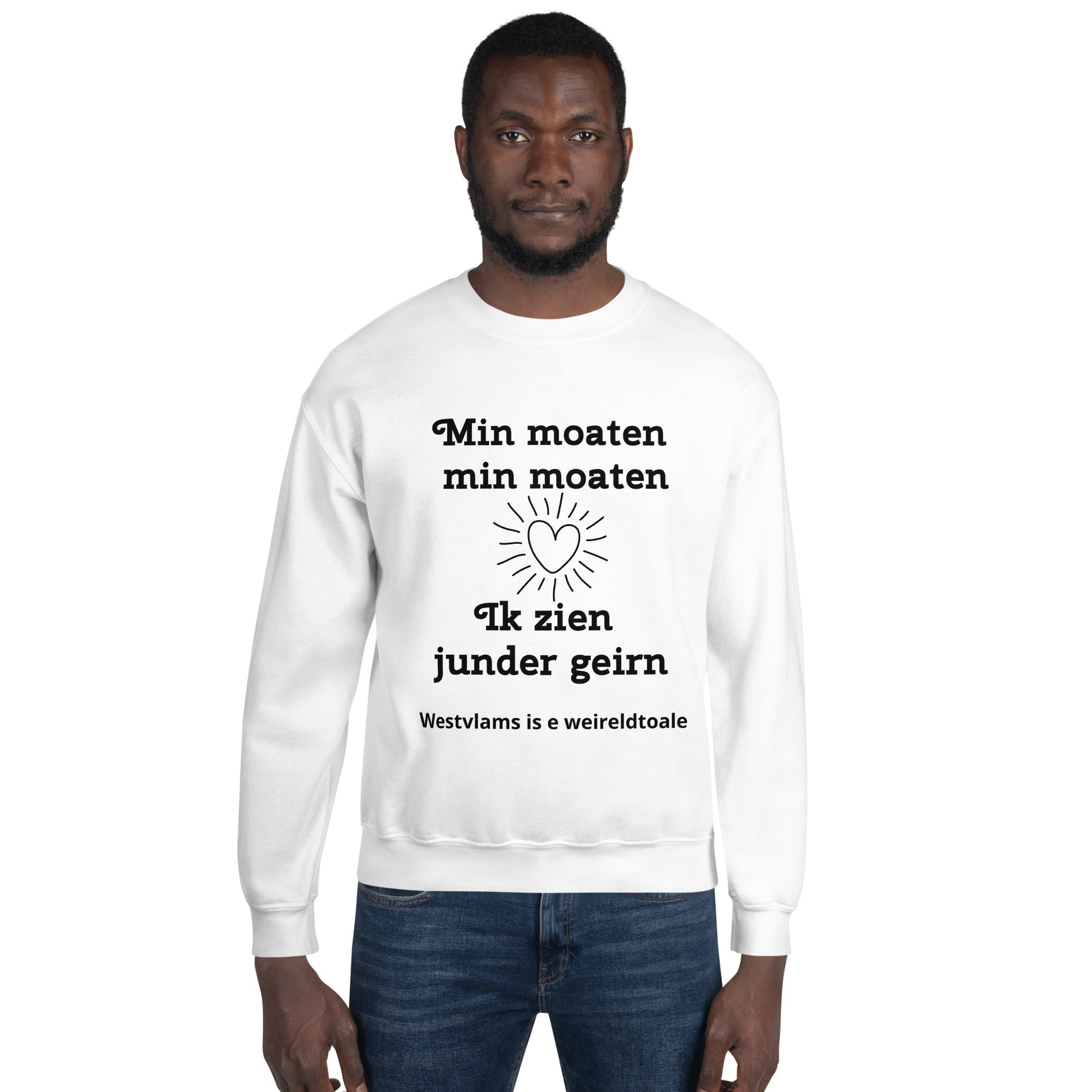 Toon je liefde voor je vrienden en het West-Vlaamse dialect met deze gezellige trui, voorzien van de hartverwarmende spreuk "Min moaten, min moaten, Ik zien junder geirn". Het schattige hartje in het midden benadrukt de boodschap van vriendschap, terwijl de zin "Westvlams is e weireldtoale" onderaan de trots op het dialect uitstraalt. Deze comfortabele en stijlvolle trui is perfect voor een ontspannen dagje uit of als een speciaal cadeau voor je beste vrienden. Draag je vriendschap en West-Vlaamse trots met flair!